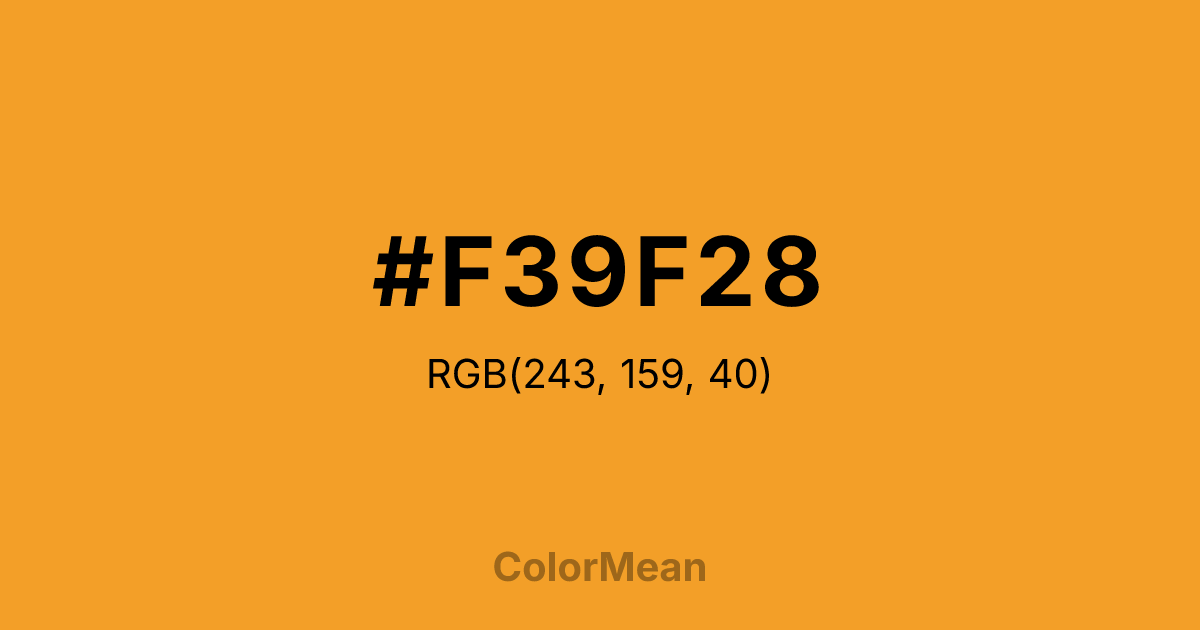#F39F28 RGB value is (243, 159, 40). The hex color red value is 243, green is 159, and blue is 40. Its HSL format shows a hue of 35°, saturation of 89 percent, and lightness of 55 percent. The CMYK process values are 0 percent, 35 percent, 84 percent, 5 percent.
