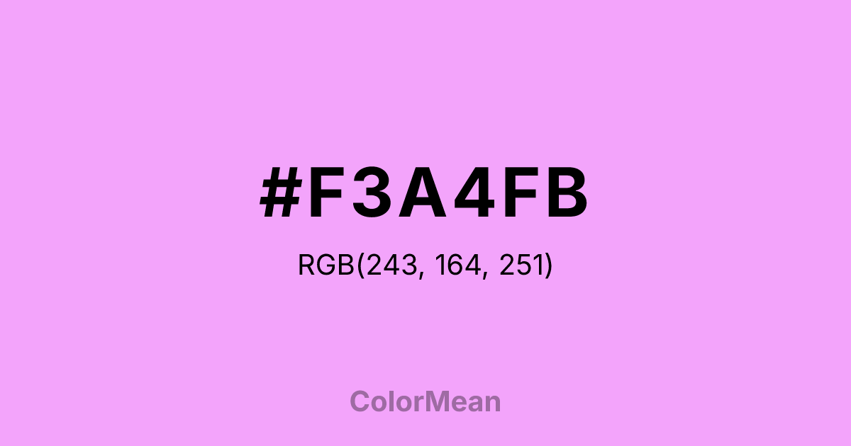 #F3A4FB RGB value is (243, 164, 251). The hex color red value is 243, green is 164, and blue is 251. Its HSL format shows a hue of 294°, saturation of 92 percent, and lightness of 81 percent. The CMYK process values are 3 percent, 35 percent, 0 percent, 2 percent.