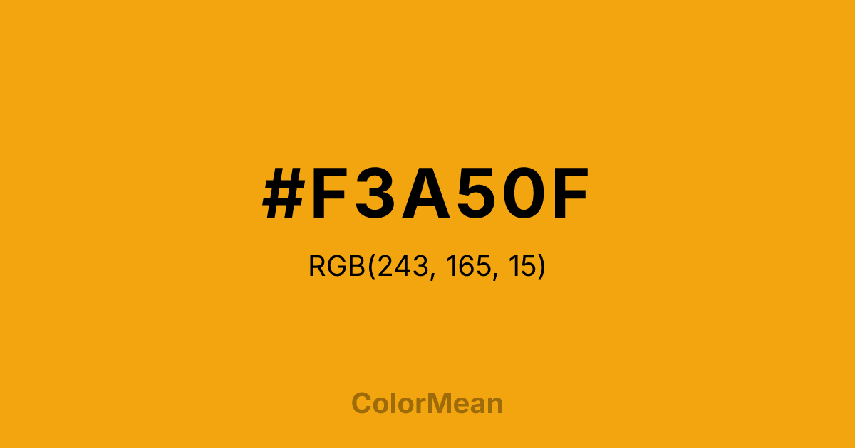 #F3A50F RGB value is (243, 165, 15). The hex color red value is 243, green is 165, and blue is 15. Its HSL format shows a hue of 39°, saturation of 90 percent, and lightness of 51 percent. The CMYK process values are 0 percent, 32 percent, 94 percent, 5 percent.