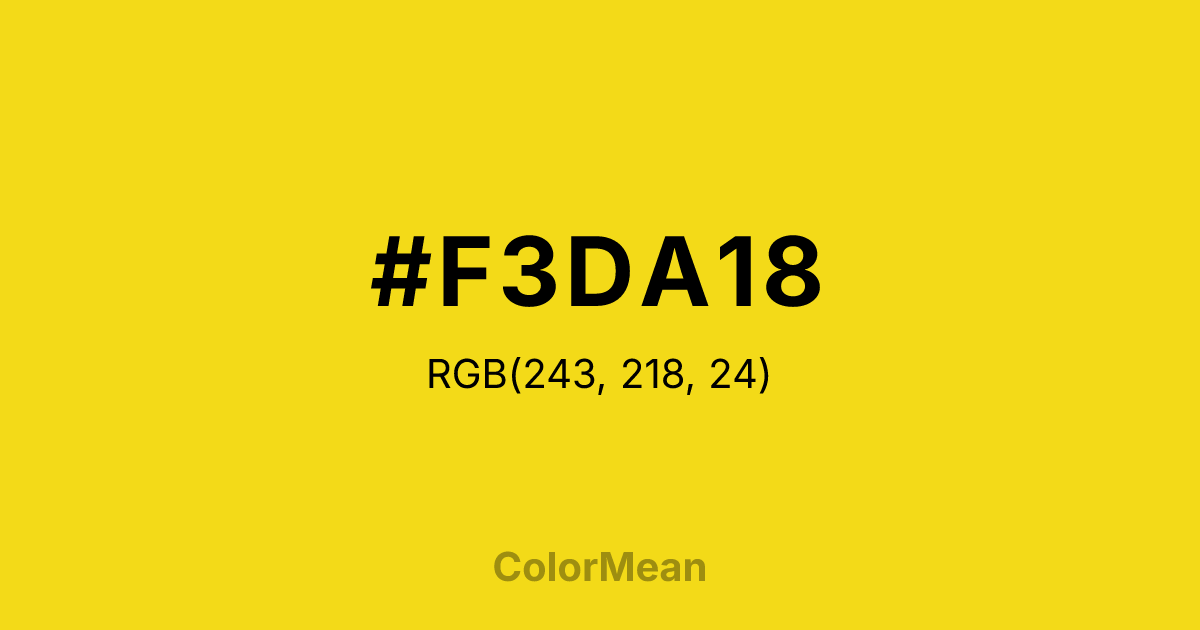 #F3DA18 RGB value is (243, 218, 24). The hex color red value is 243, green is 218, and blue is 24. Its HSL format shows a hue of 53°, saturation of 90 percent, and lightness of 52 percent. The CMYK process values are 0 percent, 10 percent, 90 percent, 5 percent.