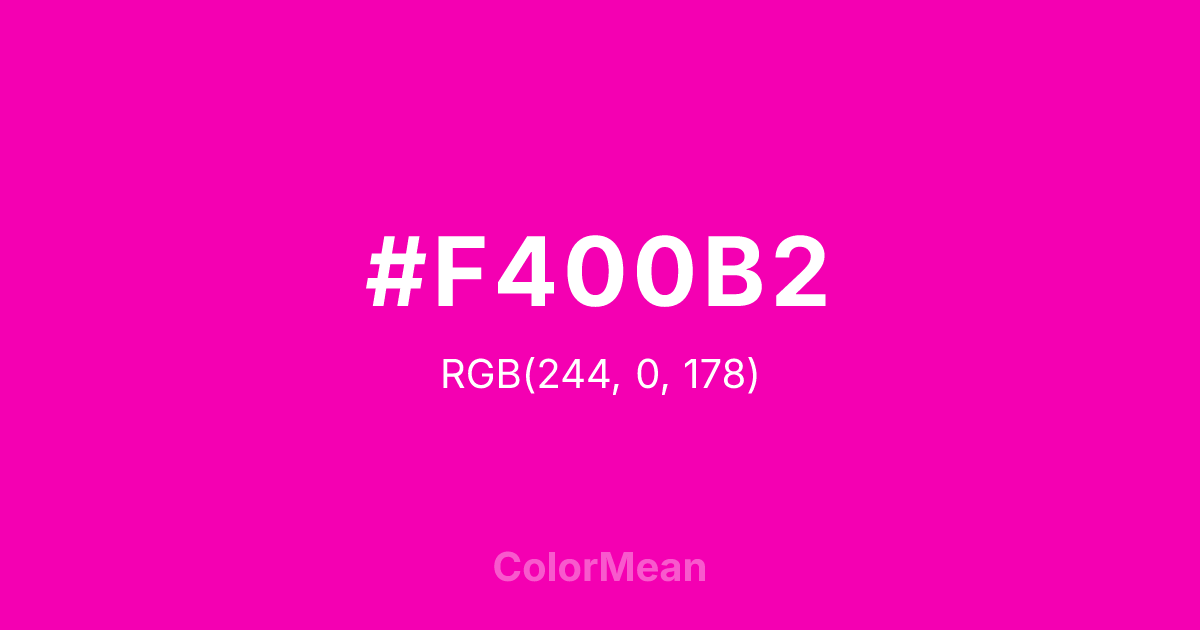 #F400B2 RGB value is (244, 0, 178). The hex color red value is 244, green is 0, and blue is 178. Its HSL format shows a hue of 316°, saturation of 100 percent, and lightness of 48 percent. The CMYK process values are 0 percent, 100 percent, 27 percent, 4 percent.