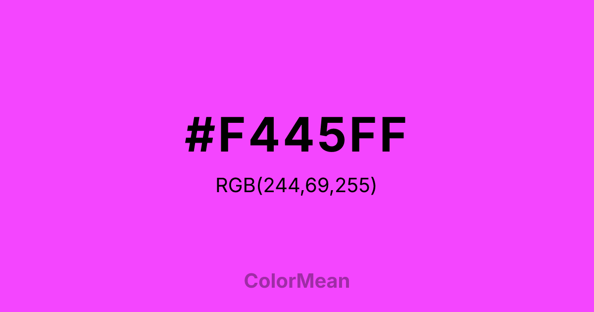 #F445FF RGB value is (244, 69, 255). The hex color red value is 244, green is 69, and blue is 255. Its HSL format shows a hue of 296°, saturation of 100 percent, and lightness of 64 percent. The CMYK process values are 4 percent, 73 percent, 0 percent, 0 percent.
