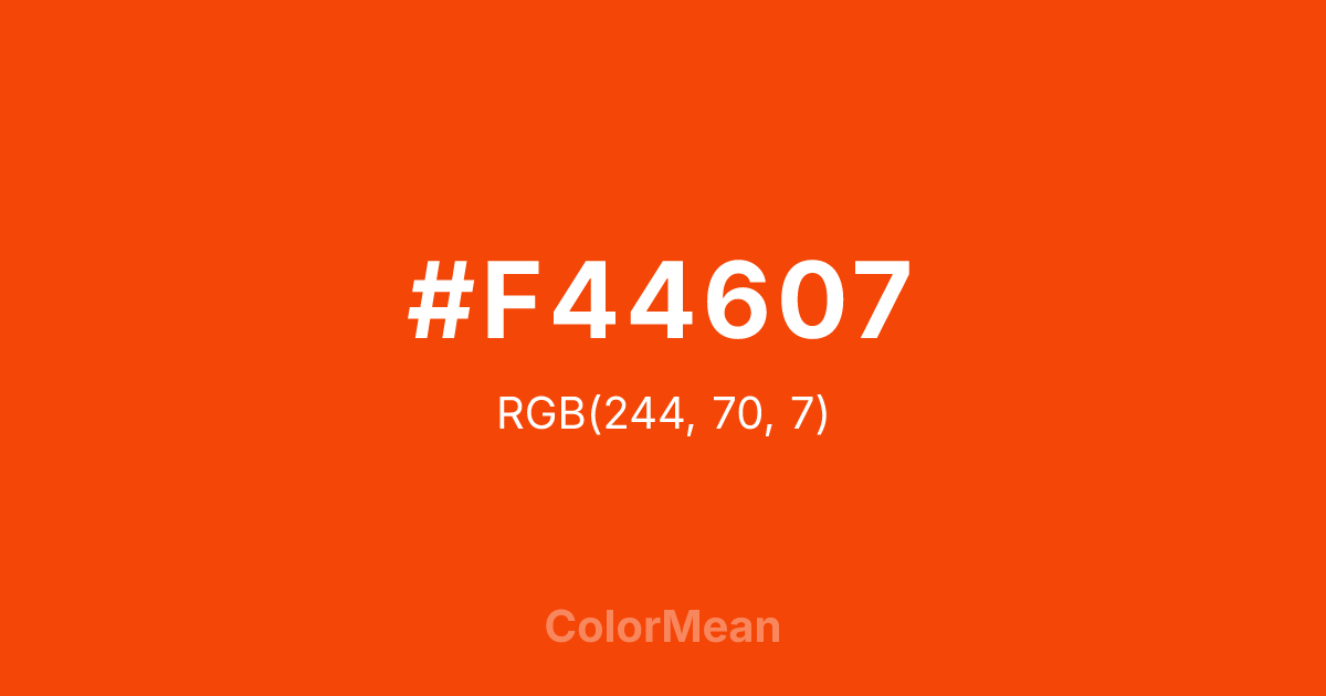 #F44607 RGB value is (244, 70, 7). The hex color red value is 244, green is 70, and blue is 7. Its HSL format shows a hue of 16°, saturation of 94 percent, and lightness of 49 percent. The CMYK process values are 0 percent, 71 percent, 97 percent, 4 percent.