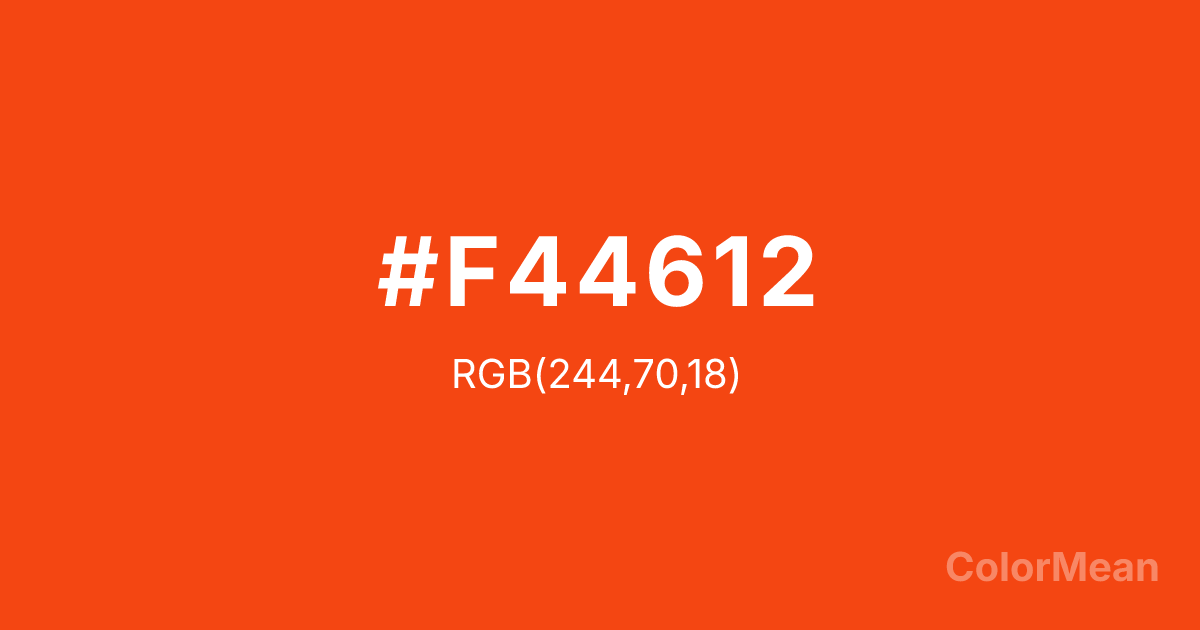 #F44612 RGB value is (244, 70, 18). The hex color red value is 244, green is 70, and blue is 18. Its HSL format shows a hue of 14°, saturation of 91 percent, and lightness of 51 percent. The CMYK process values are 0 percent, 71 percent, 93 percent, 4 percent.