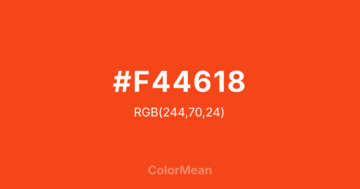 #F44618 RGB value is (244, 70, 24). The hex color red value is 244, green is 70, and blue is 24. Its HSL format shows a hue of 13°, saturation of 91 percent, and lightness of 53 percent. The CMYK process values are 0 percent, 71 percent, 90 percent, 4 percent.
