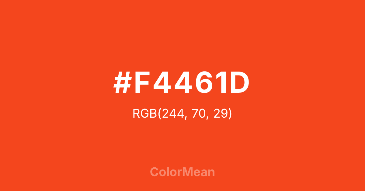 #F4461D RGB value is (244, 70, 29). The hex color red value is 244, green is 70, and blue is 29. Its HSL format shows a hue of 11°, saturation of 91 percent, and lightness of 54 percent. The CMYK process values are 0 percent, 71 percent, 88 percent, 4 percent.