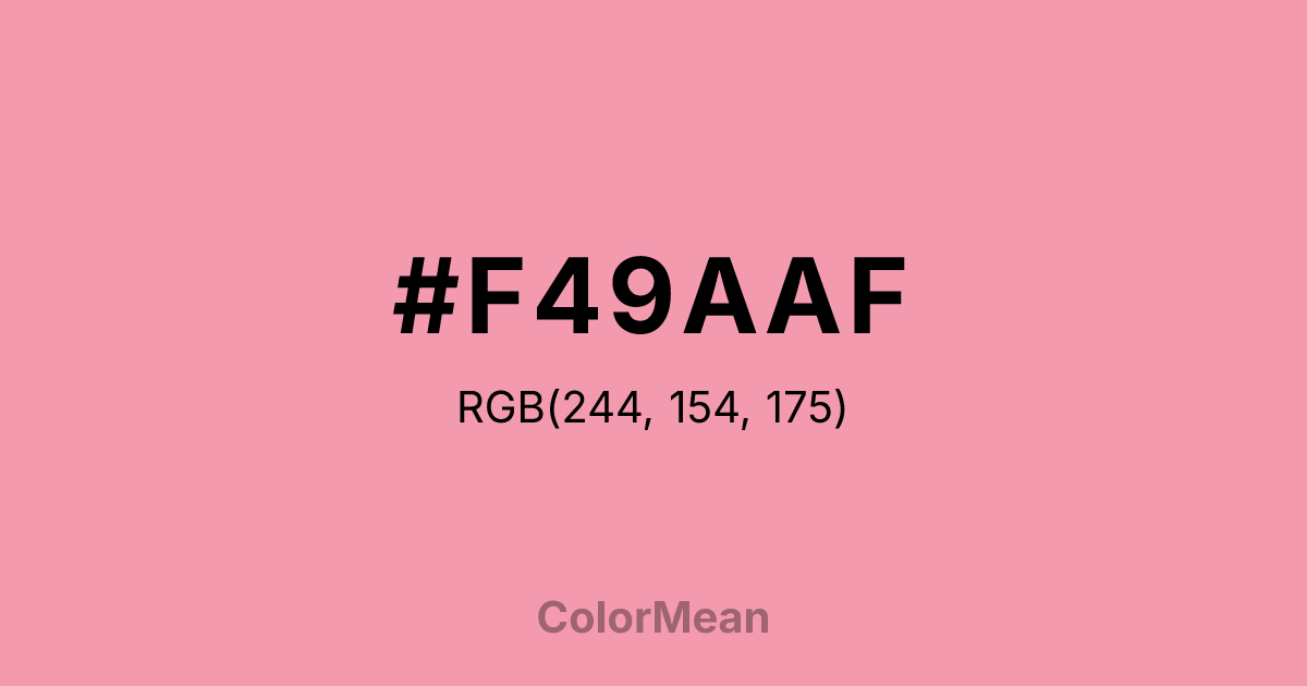 #F49AAF RGB value is (244, 154, 175). The hex color red value is 244, green is 154, and blue is 175. Its HSL format shows a hue of 346°, saturation of 80 percent, and lightness of 78 percent. The CMYK process values are 0 percent, 37 percent, 28 percent, 4 percent.