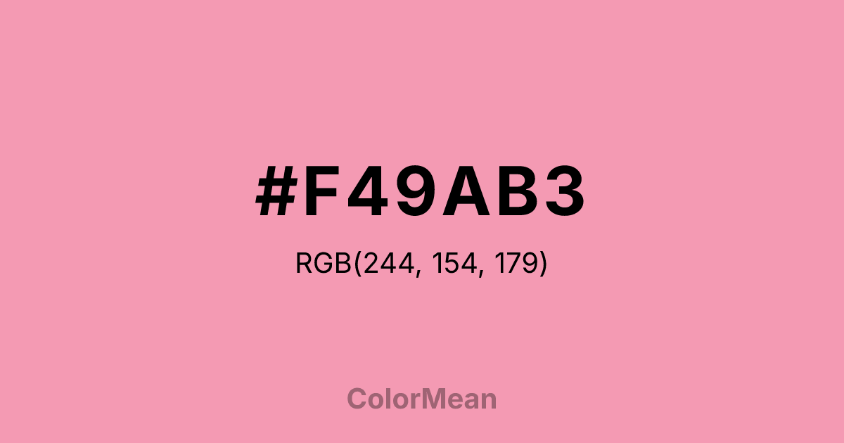#F49AB3 RGB value is (244, 154, 179). The hex color red value is 244, green is 154, and blue is 179. Its HSL format shows a hue of 343°, saturation of 80 percent, and lightness of 78 percent. The CMYK process values are 0 percent, 37 percent, 27 percent, 4 percent.
