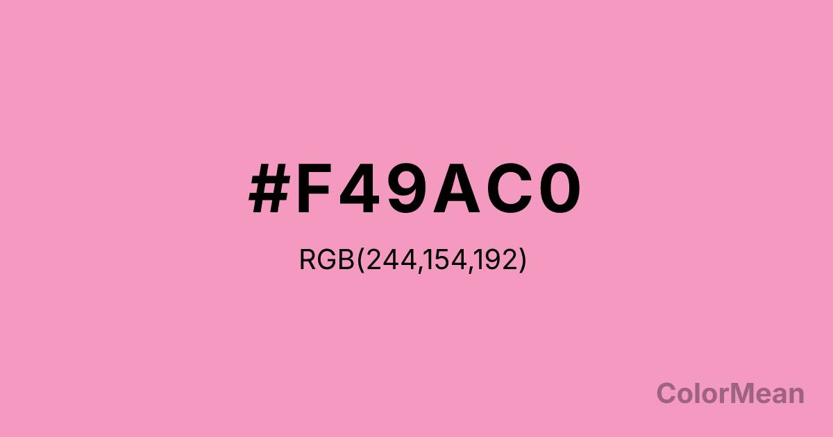 #F49AC0 RGB value is (244, 154, 192). The hex color red value is 244, green is 154, and blue is 192. Its HSL format shows a hue of 335°, saturation of 80 percent, and lightness of 78 percent. The CMYK process values are 0 percent, 37 percent, 21 percent, 4 percent.
