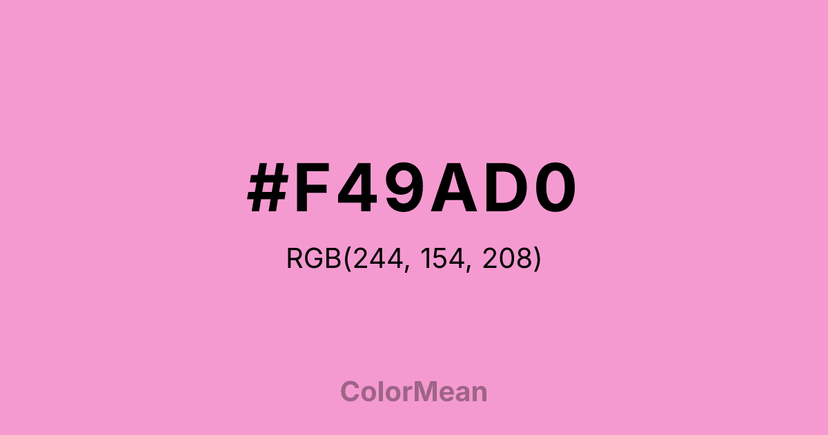 #F49AD0 RGB value is (244, 154, 208). The hex color red value is 244, green is 154, and blue is 208. Its HSL format shows a hue of 324°, saturation of 80 percent, and lightness of 78 percent. The CMYK process values are 0 percent, 37 percent, 15 percent, 4 percent.