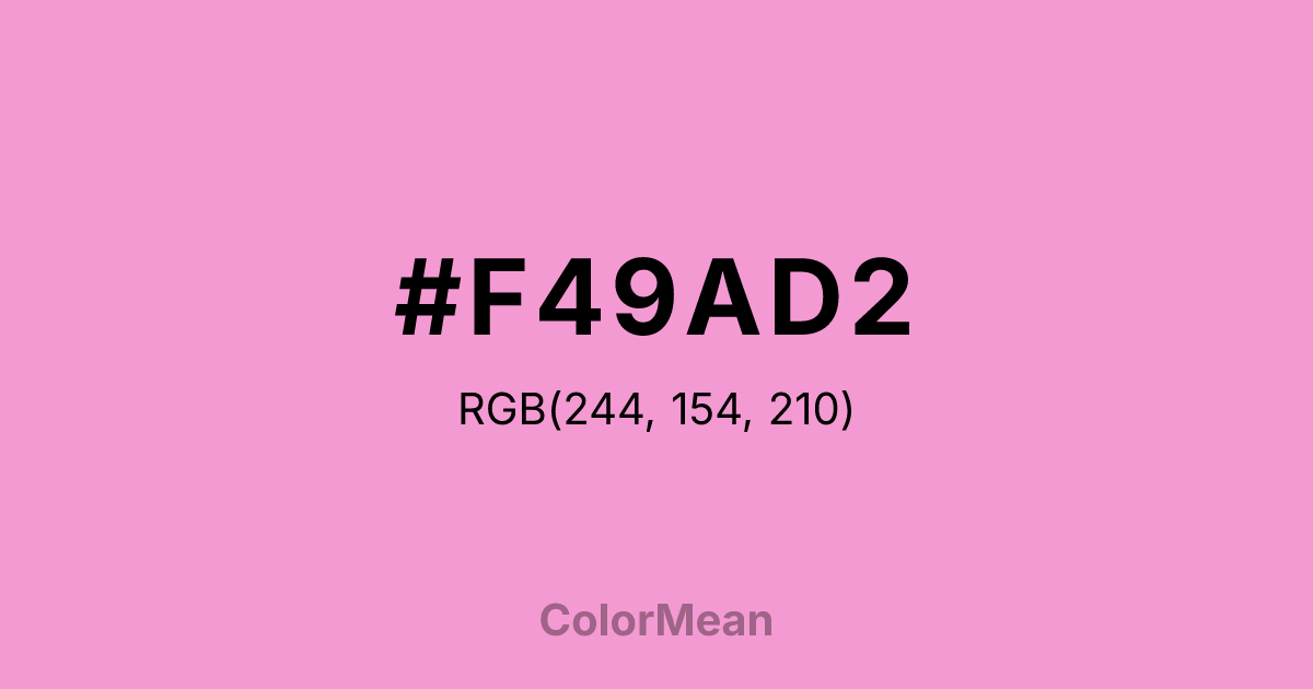 #F49AD2 RGB value is (244, 154, 210). The hex color red value is 244, green is 154, and blue is 210. Its HSL format shows a hue of 323°, saturation of 80 percent, and lightness of 78 percent. The CMYK process values are 0 percent, 37 percent, 14 percent, 4 percent.