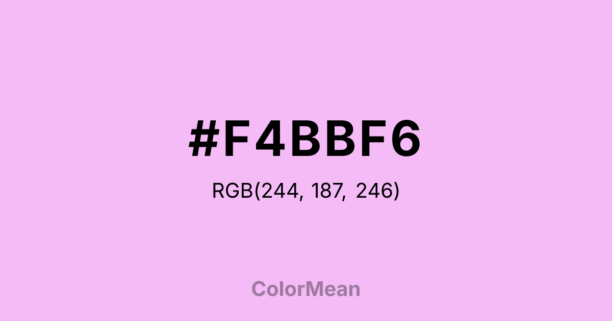 #F4BBF6 RGB value is (244, 187, 246). The hex color red value is 244, green is 187, and blue is 246. Its HSL format shows a hue of 298°, saturation of 77 percent, and lightness of 85 percent. The CMYK process values are 1 percent, 24 percent, 0 percent, 4 percent.