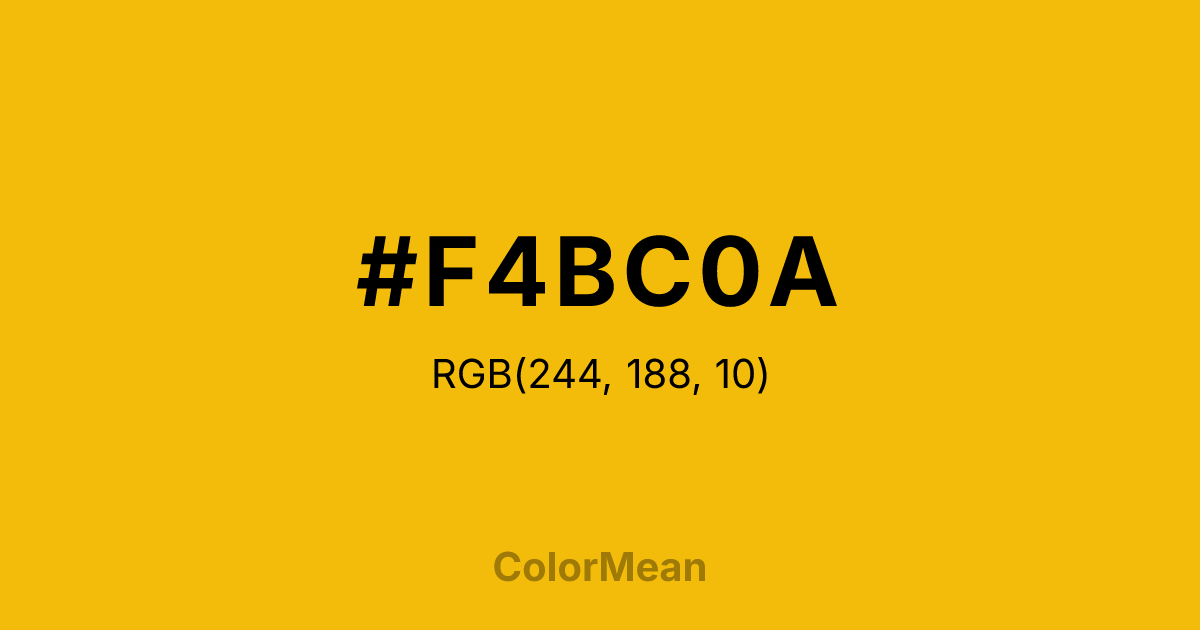 #F4BC0A RGB value is (244, 188, 10). The hex color red value is 244, green is 188, and blue is 10. Its HSL format shows a hue of 46°, saturation of 92 percent, and lightness of 50 percent. The CMYK process values are 0 percent, 23 percent, 96 percent, 4 percent.