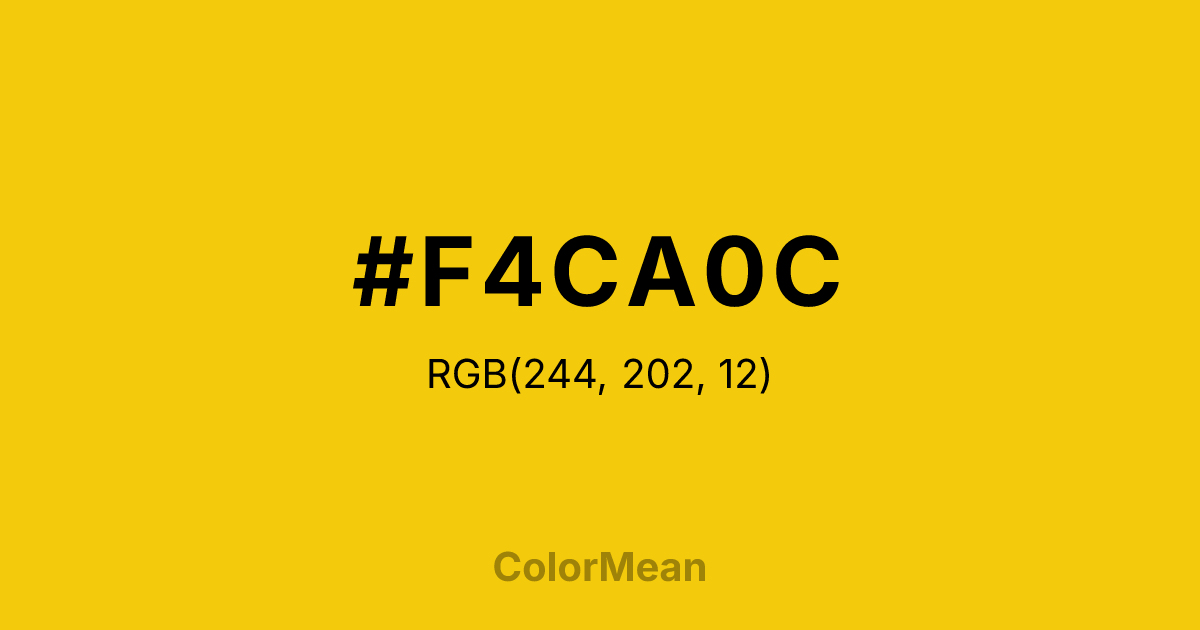 #F4CA0C RGB value is (244, 202, 12). The hex color red value is 244, green is 202, and blue is 12. Its HSL format shows a hue of 49°, saturation of 91 percent, and lightness of 50 percent. The CMYK process values are 0 percent, 17 percent, 95 percent, 4 percent.