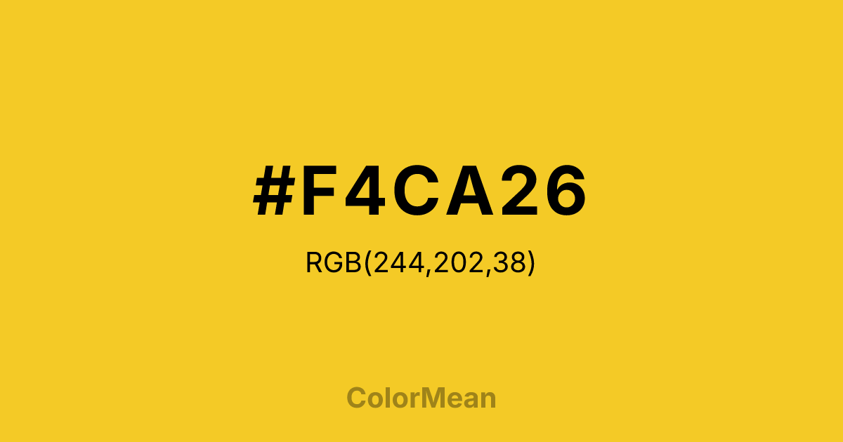 #F4CA26 RGB value is (244, 202, 38). The hex color red value is 244, green is 202, and blue is 38. Its HSL format shows a hue of 48°, saturation of 90 percent, and lightness of 55 percent. The CMYK process values are 0 percent, 17 percent, 84 percent, 4 percent.