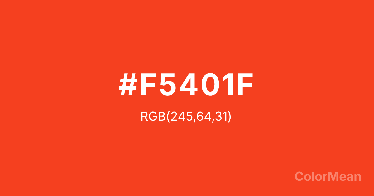 #F5401F RGB value is (245, 64, 31). The hex color red value is 245, green is 64, and blue is 31. Its HSL format shows a hue of 9°, saturation of 91 percent, and lightness of 54 percent. The CMYK process values are 0 percent, 74 percent, 87 percent, 4 percent.