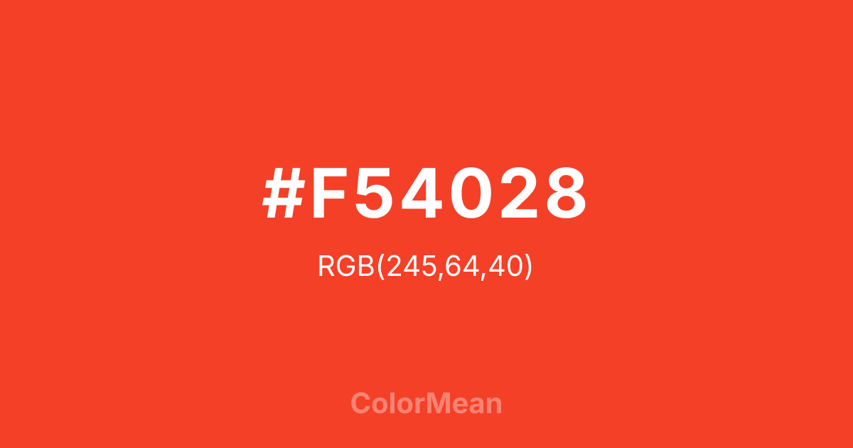 #F54028 RGB value is (245, 64, 40). The hex color red value is 245, green is 64, and blue is 40. Its HSL format shows a hue of 7°, saturation of 91 percent, and lightness of 56 percent. The CMYK process values are 0 percent, 74 percent, 84 percent, 4 percent.