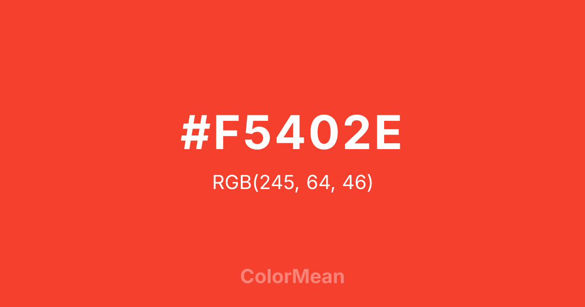 #F5402E RGB value is (245, 64, 46). The hex color red value is 245, green is 64, and blue is 46. Its HSL format shows a hue of 5°, saturation of 91 percent, and lightness of 57 percent. The CMYK process values are 0 percent, 74 percent, 81 percent, 4 percent.