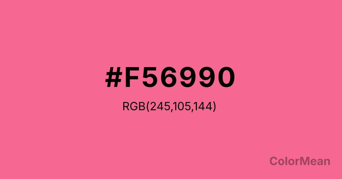 #F56990 RGB value is (245, 105, 144). The hex color red value is 245, green is 105, and blue is 144. Its HSL format shows a hue of 343°, saturation of 88 percent, and lightness of 69 percent. The CMYK process values are 0 percent, 57 percent, 41 percent, 4 percent.