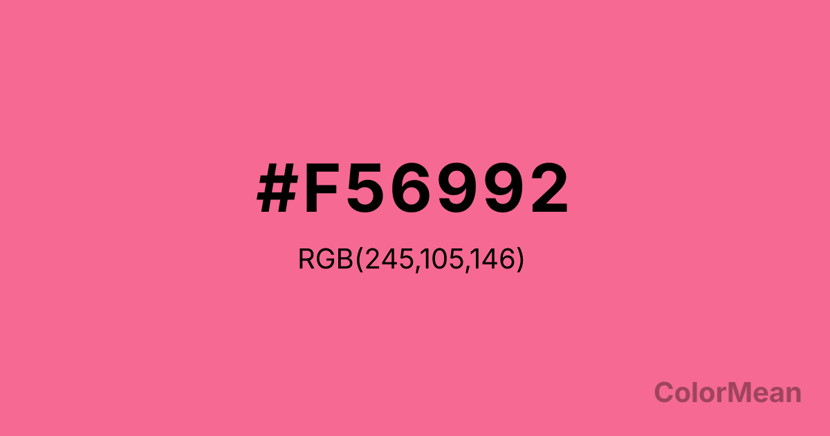#F56992 RGB value is (245, 105, 146). The hex color red value is 245, green is 105, and blue is 146. Its HSL format shows a hue of 342°, saturation of 88 percent, and lightness of 69 percent. The CMYK process values are 0 percent, 57 percent, 40 percent, 4 percent.