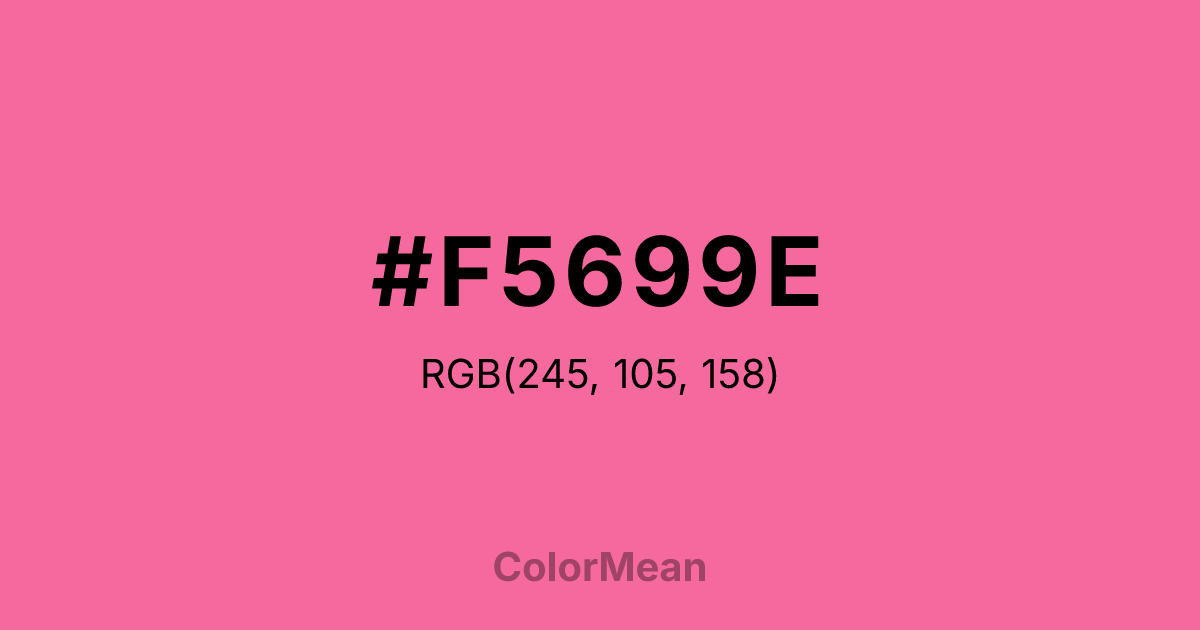 #F5699E RGB value is (245, 105, 158). The hex color red value is 245, green is 105, and blue is 158. Its HSL format shows a hue of 337°, saturation of 88 percent, and lightness of 69 percent. The CMYK process values are 0 percent, 57 percent, 36 percent, 4 percent.
