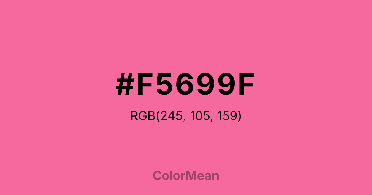 #F5699F RGB value is (245, 105, 159). The hex color red value is 245, green is 105, and blue is 159. Its HSL format shows a hue of 337°, saturation of 88 percent, and lightness of 69 percent. The CMYK process values are 0 percent, 57 percent, 35 percent, 4 percent.