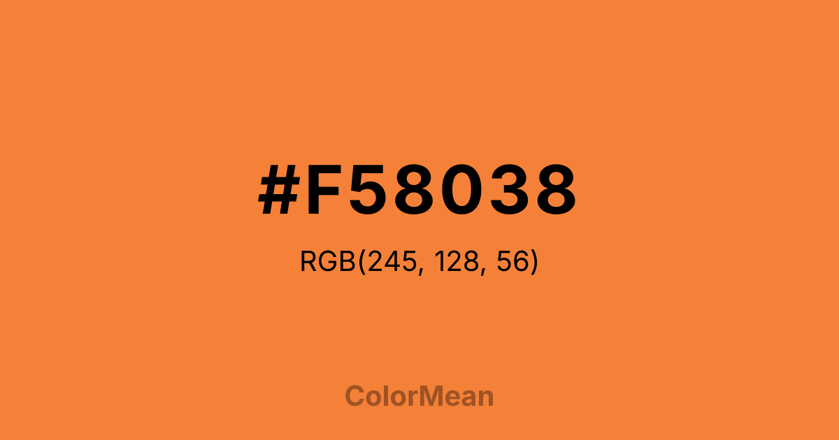 #F58038 RGB value is (245, 128, 56). The hex color red value is 245, green is 128, and blue is 56. Its HSL format shows a hue of 23°, saturation of 90 percent, and lightness of 59 percent. The CMYK process values are 0 percent, 48 percent, 77 percent, 4 percent.