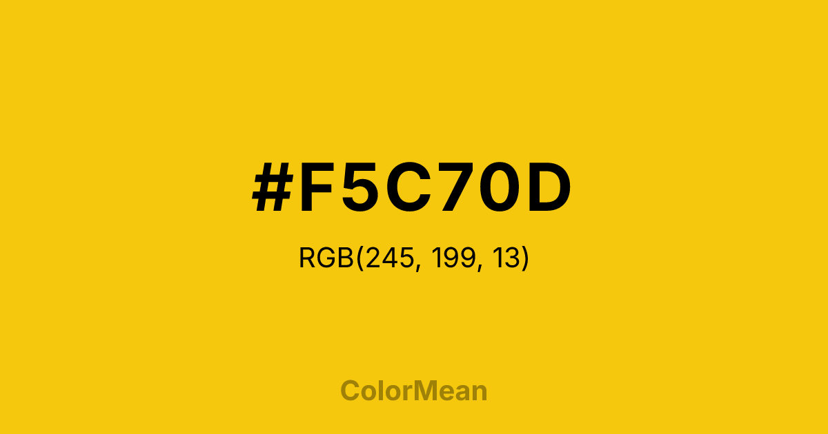 #F5C70D RGB value is (245, 199, 13). The hex color red value is 245, green is 199, and blue is 13. Its HSL format shows a hue of 48°, saturation of 92 percent, and lightness of 51 percent. The CMYK process values are 0 percent, 19 percent, 95 percent, 4 percent.