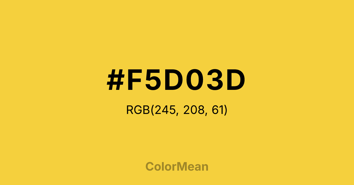 #F5D03D RGB value is (245, 208, 61). The hex color red value is 245, green is 208, and blue is 61. Its HSL format shows a hue of 48°, saturation of 90 percent, and lightness of 60 percent. The CMYK process values are 0 percent, 15 percent, 75 percent, 4 percent.
