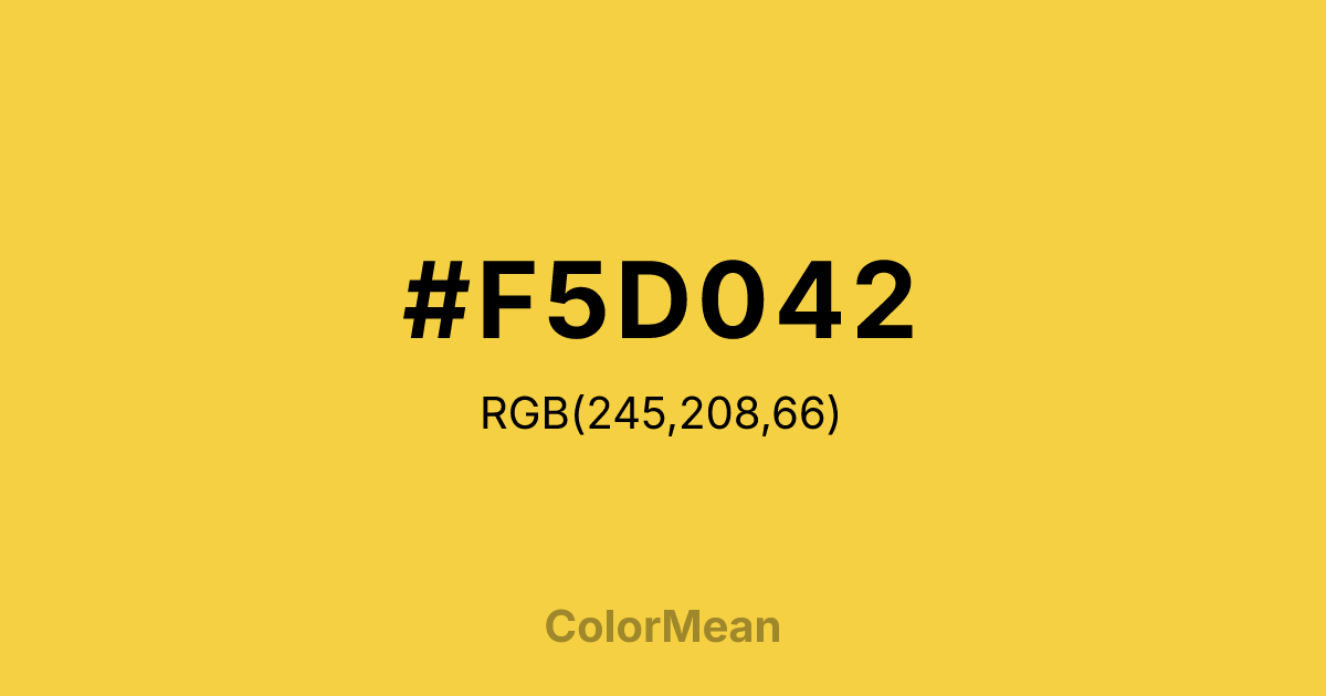 #F5D042 RGB value is (245, 208, 66). The hex color red value is 245, green is 208, and blue is 66. Its HSL format shows a hue of 48°, saturation of 90 percent, and lightness of 61 percent. The CMYK process values are 0 percent, 15 percent, 73 percent, 4 percent.