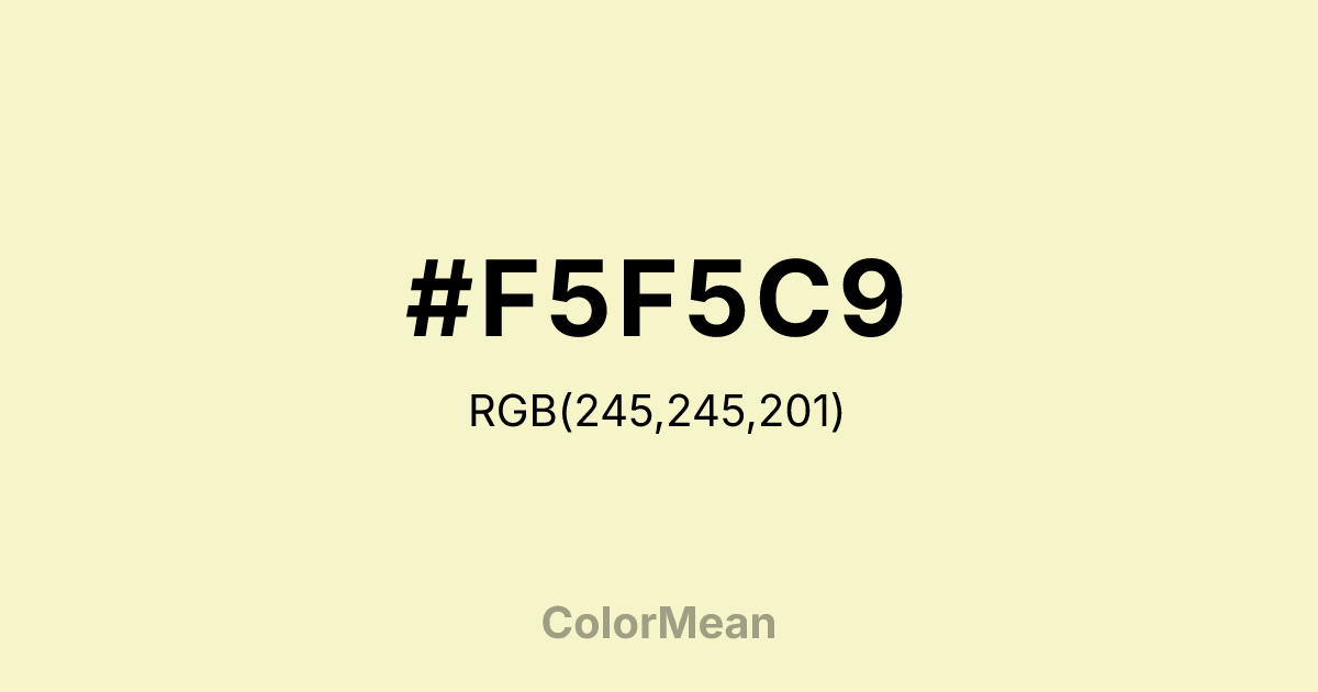#F5F5C9 RGB value is (245, 245, 201). The hex color red value is 245, green is 245, and blue is 201. Its HSL format shows a hue of 60°, saturation of 69 percent, and lightness of 87 percent. The CMYK process values are 0 percent, 0 percent, 18 percent, 4 percent.
