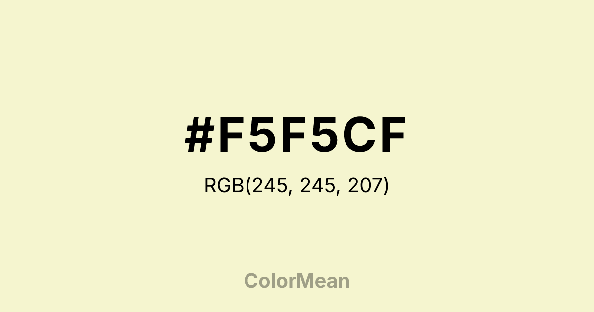 #F5F5CF RGB value is (245, 245, 207). The hex color red value is 245, green is 245, and blue is 207. Its HSL format shows a hue of 60°, saturation of 66 percent, and lightness of 89 percent. The CMYK process values are 0 percent, 0 percent, 16 percent, 4 percent.