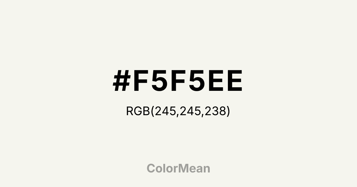 #F5F5EE RGB value is (245, 245, 238). The hex color red value is 245, green is 245, and blue is 238. Its HSL format shows a hue of 60°, saturation of 26 percent, and lightness of 95 percent. The CMYK process values are 0 percent, 0 percent, 3 percent, 4 percent.