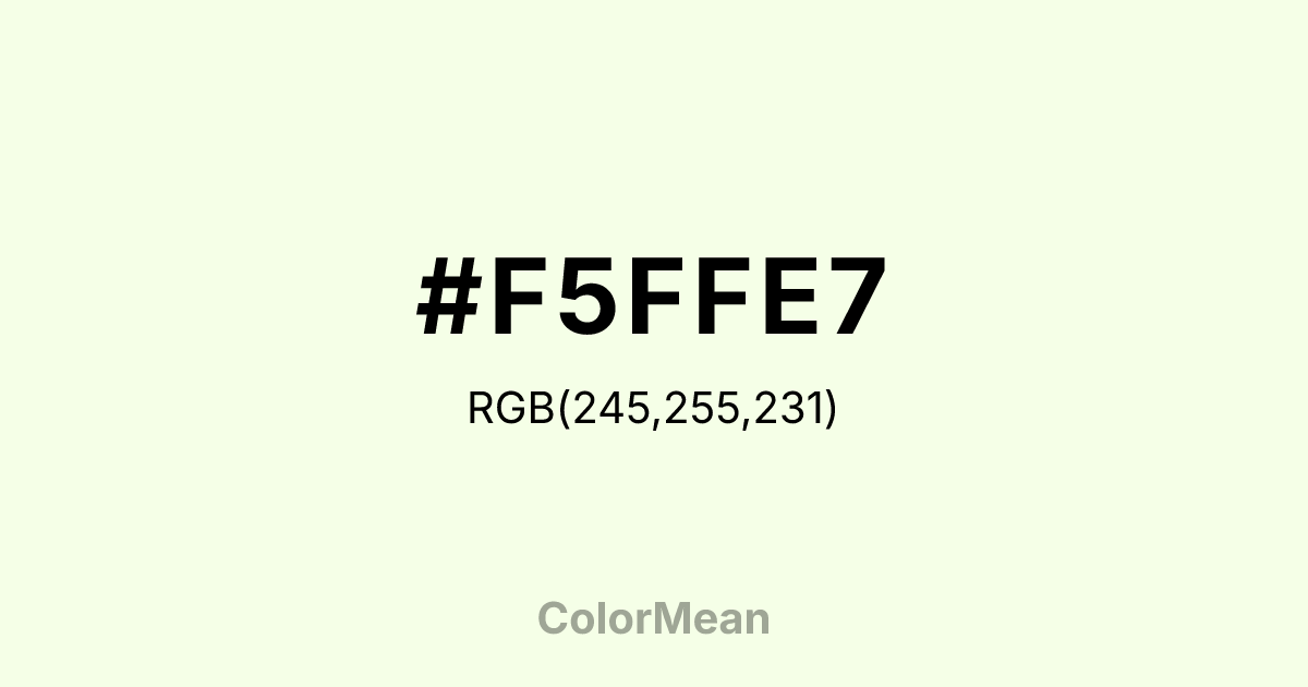 #F5FFE7 RGB value is (245, 255, 231). The hex color red value is 245, green is 255, and blue is 231. Its HSL format shows a hue of 85°, saturation of 100 percent, and lightness of 95 percent. The CMYK process values are 4 percent, 0 percent, 9 percent, 0 percent.