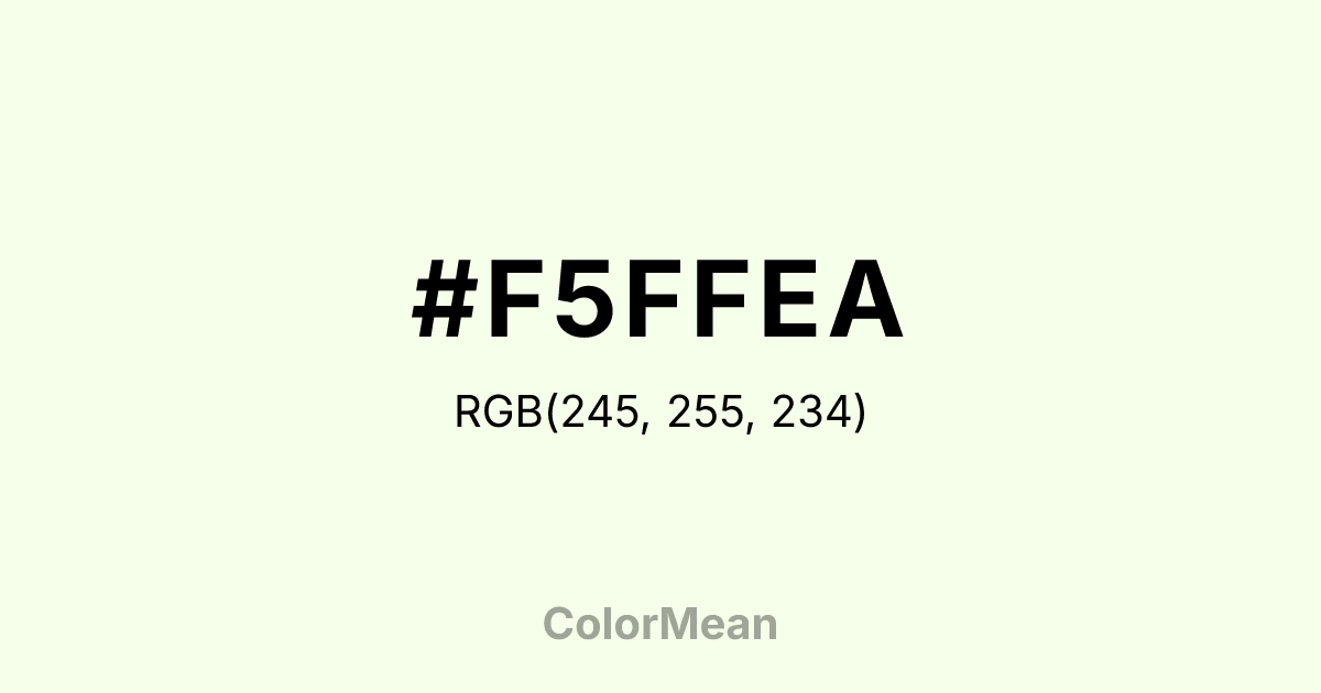 #F5FFEA RGB value is (245, 255, 234). The hex color red value is 245, green is 255, and blue is 234. Its HSL format shows a hue of 89°, saturation of 100 percent, and lightness of 96 percent. The CMYK process values are 4 percent, 0 percent, 8 percent, 0 percent.
