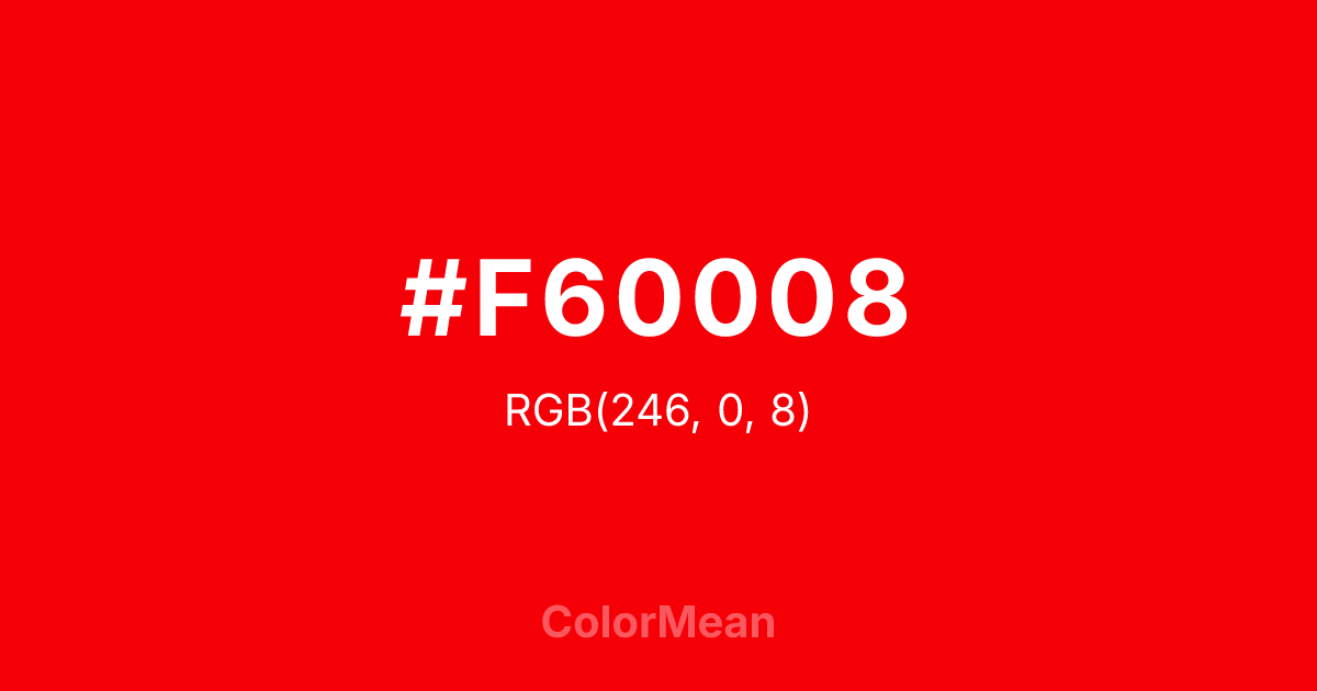 #F60008 RGB value is (246, 0, 8). The hex color red value is 246, green is 0, and blue is 8. Its HSL format shows a hue of 358°, saturation of 100 percent, and lightness of 48 percent. The CMYK process values are 0 percent, 100 percent, 97 percent, 4 percent.