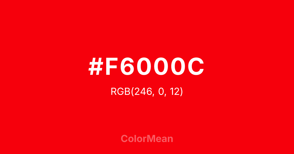 #F6000C RGB value is (246, 0, 12). The hex color red value is 246, green is 0, and blue is 12. Its HSL format shows a hue of 357°, saturation of 100 percent, and lightness of 48 percent. The CMYK process values are 0 percent, 100 percent, 95 percent, 4 percent.