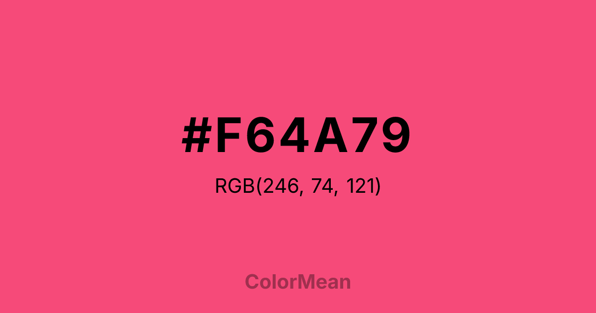 #F64A79 RGB value is (246, 74, 121). The hex color red value is 246, green is 74, and blue is 121. Its HSL format shows a hue of 344°, saturation of 91 percent, and lightness of 63 percent. The CMYK process values are 0 percent, 70 percent, 51 percent, 4 percent.