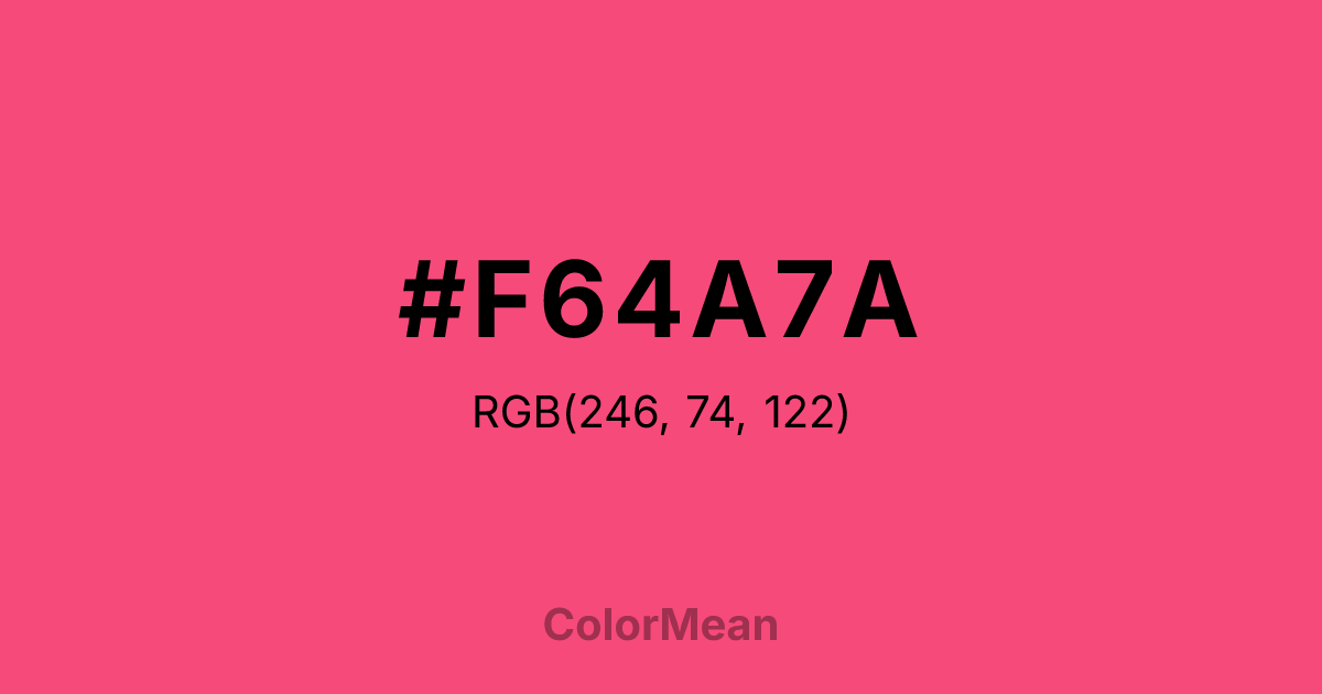 #F64A7A RGB value is (246, 74, 122). The hex color red value is 246, green is 74, and blue is 122. Its HSL format shows a hue of 343°, saturation of 91 percent, and lightness of 63 percent. The CMYK process values are 0 percent, 70 percent, 50 percent, 4 percent.
