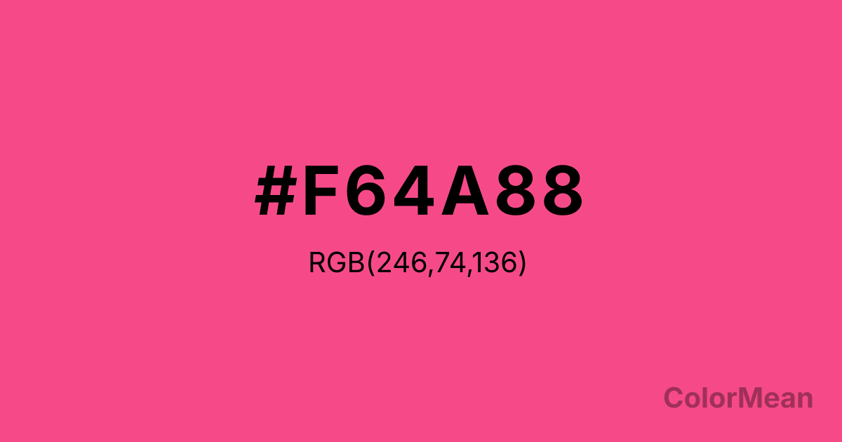 #F64A88 RGB value is (246, 74, 136). The hex color red value is 246, green is 74, and blue is 136. Its HSL format shows a hue of 338°, saturation of 91 percent, and lightness of 63 percent. The CMYK process values are 0 percent, 70 percent, 45 percent, 4 percent.