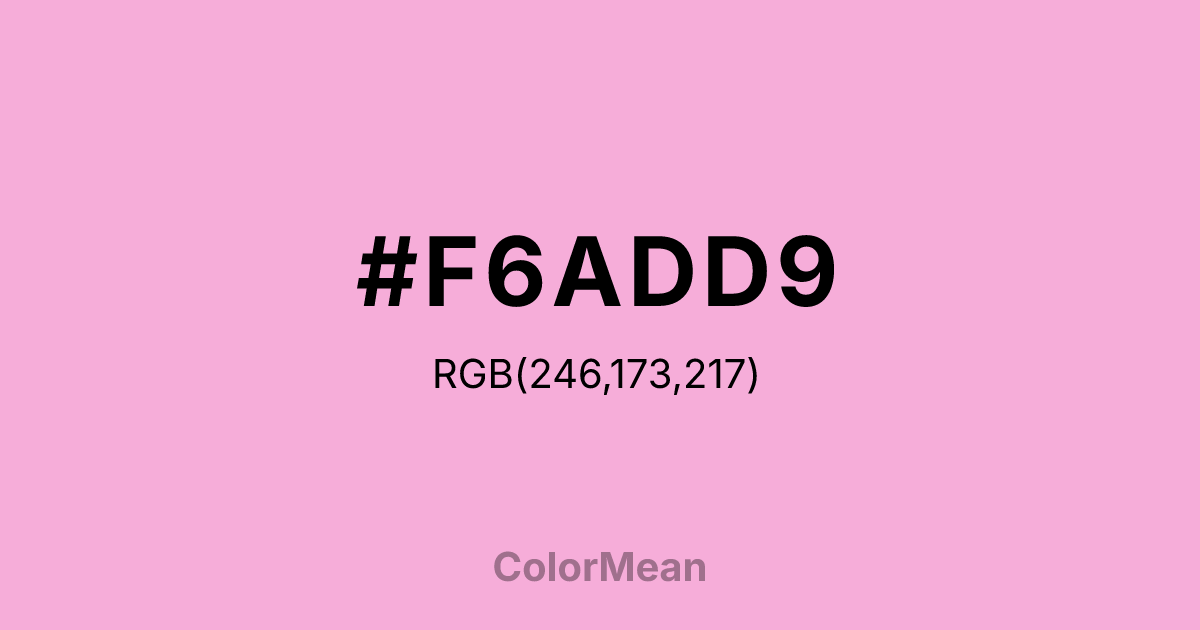 #F6ADD9 RGB value is (246, 173, 217). The hex color red value is 246, green is 173, and blue is 217. Its HSL format shows a hue of 324°, saturation of 80 percent, and lightness of 82 percent. The CMYK process values are 0 percent, 30 percent, 12 percent, 4 percent.