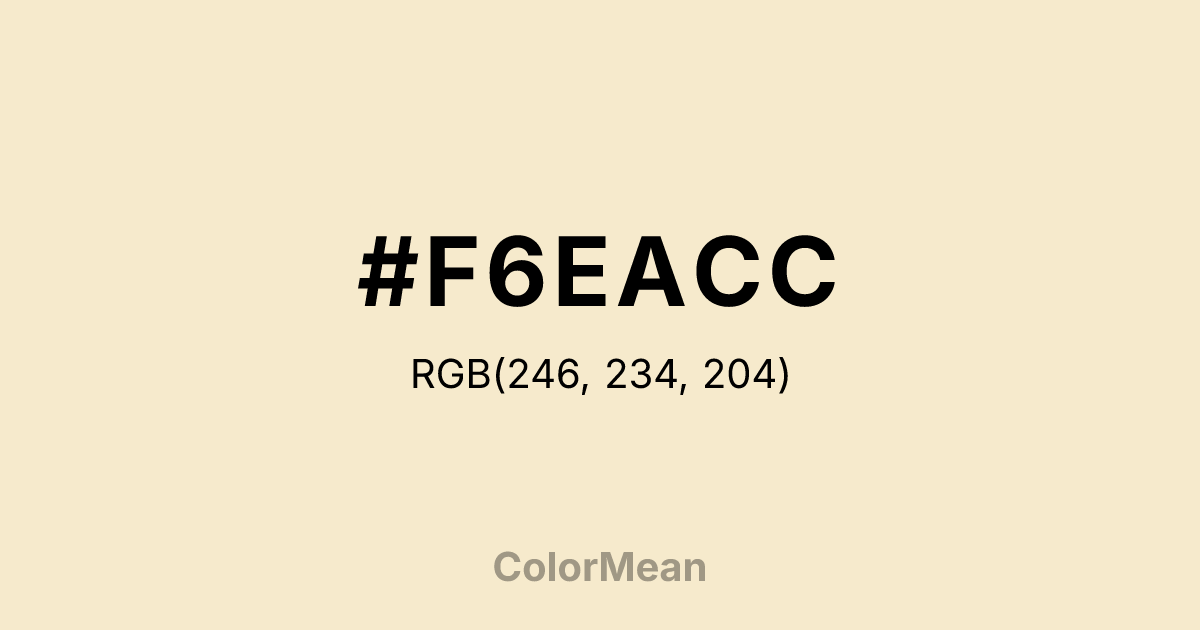 #F6EACC RGB value is (246, 234, 204). The hex color red value is 246, green is 234, and blue is 204. Its HSL format shows a hue of 43°, saturation of 70 percent, and lightness of 88 percent. The CMYK process values are 0 percent, 5 percent, 17 percent, 4 percent.