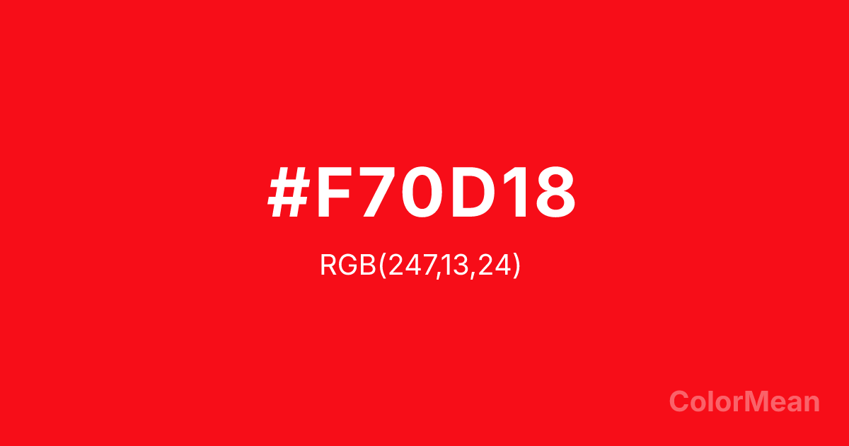 #F70D18 RGB value is (247, 13, 24). The hex color red value is 247, green is 13, and blue is 24. Its HSL format shows a hue of 357°, saturation of 94 percent, and lightness of 51 percent. The CMYK process values are 0 percent, 95 percent, 90 percent, 3 percent.