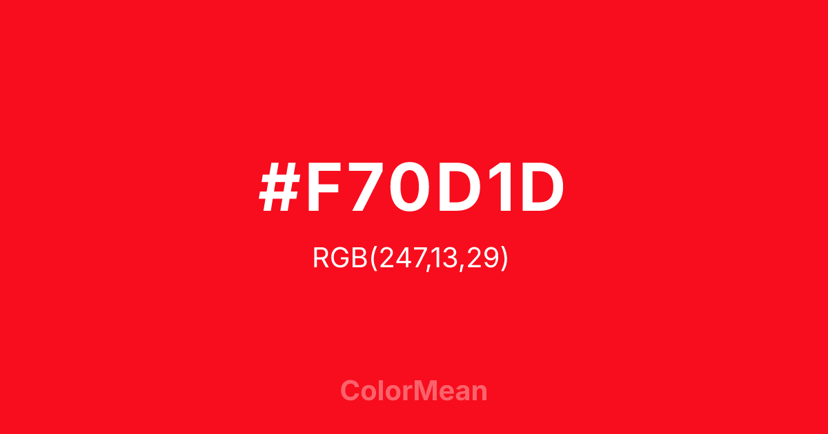 #F70D1D RGB value is (247, 13, 29). The hex color red value is 247, green is 13, and blue is 29. Its HSL format shows a hue of 356°, saturation of 94 percent, and lightness of 51 percent. The CMYK process values are 0 percent, 95 percent, 88 percent, 3 percent.
