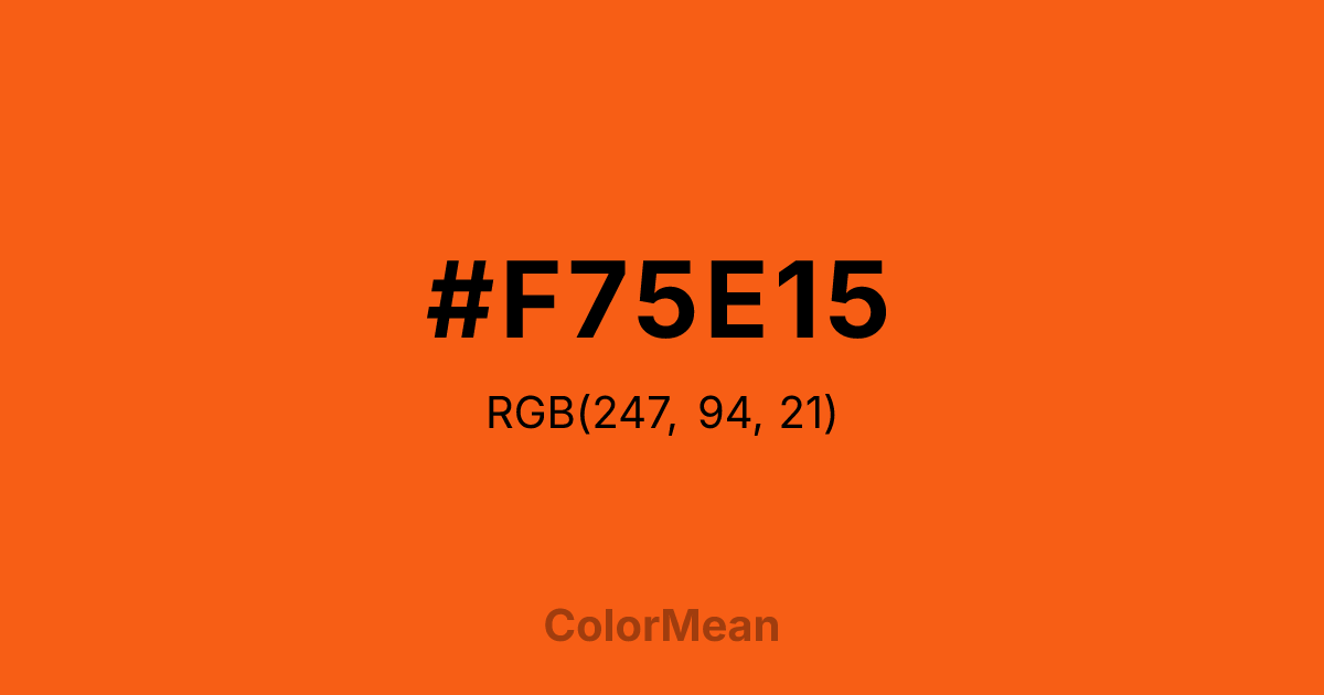 #F75E15 RGB value is (247, 94, 21). The hex color red value is 247, green is 94, and blue is 21. Its HSL format shows a hue of 19°, saturation of 93 percent, and lightness of 53 percent. The CMYK process values are 0 percent, 62 percent, 91 percent, 3 percent.