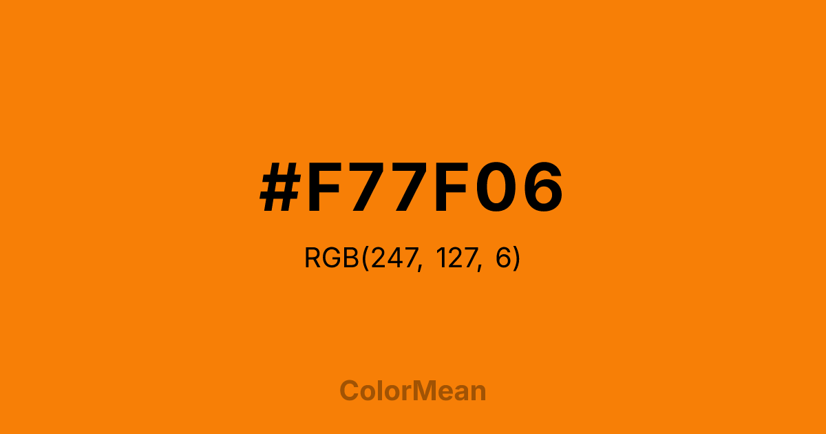 #F77F06 RGB value is (247, 127, 6). The hex color red value is 247, green is 127, and blue is 6. Its HSL format shows a hue of 30°, saturation of 95 percent, and lightness of 50 percent. The CMYK process values are 0 percent, 49 percent, 98 percent, 3 percent.