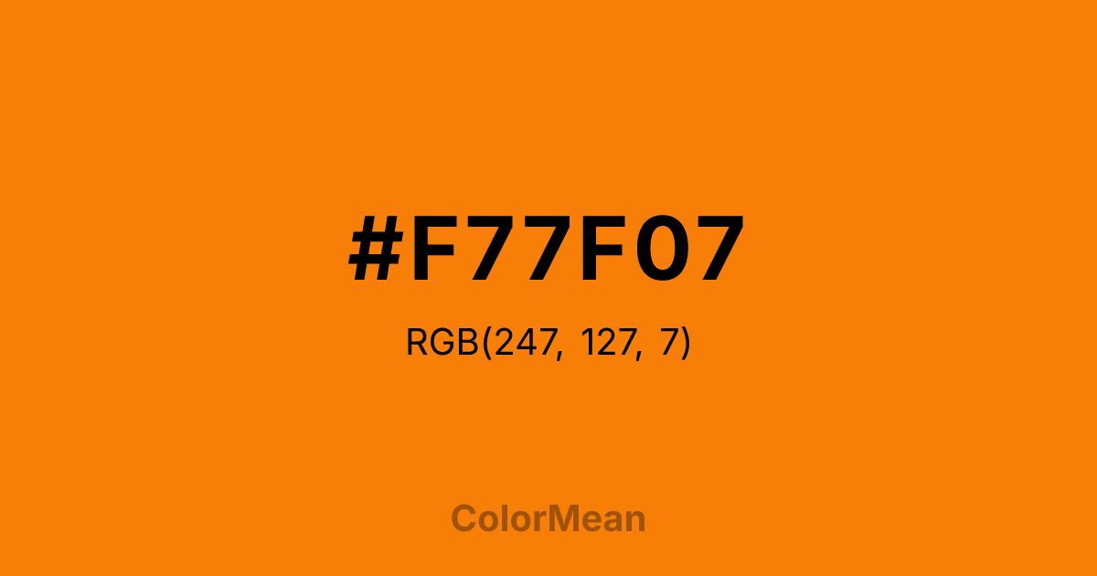 #F77F07 RGB value is (247, 127, 7). The hex color red value is 247, green is 127, and blue is 7. Its HSL format shows a hue of 30°, saturation of 94 percent, and lightness of 50 percent. The CMYK process values are 0 percent, 49 percent, 97 percent, 3 percent.