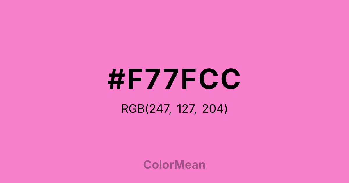 #F77FCC RGB value is (247, 127, 204). The hex color red value is 247, green is 127, and blue is 204. Its HSL format shows a hue of 322°, saturation of 88 percent, and lightness of 73 percent. The CMYK process values are 0 percent, 49 percent, 17 percent, 3 percent.