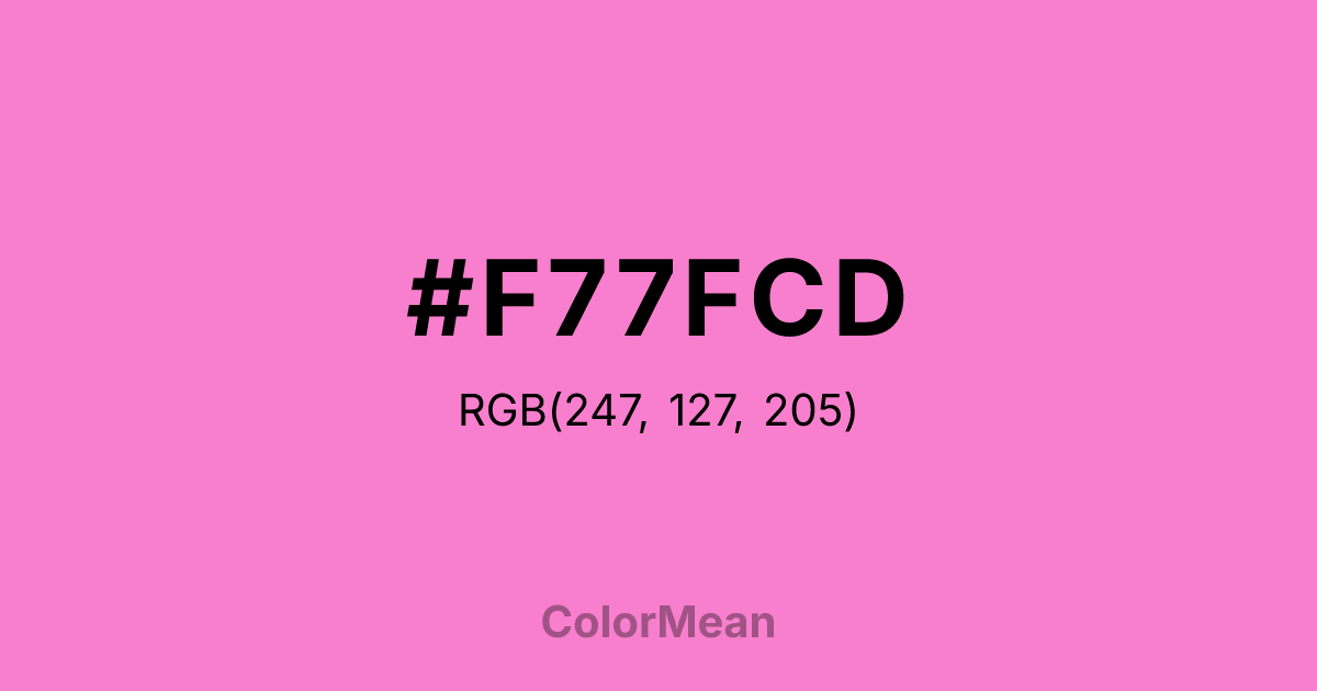#F77FCD RGB value is (247, 127, 205). The hex color red value is 247, green is 127, and blue is 205. Its HSL format shows a hue of 321°, saturation of 88 percent, and lightness of 73 percent. The CMYK process values are 0 percent, 49 percent, 17 percent, 3 percent.
