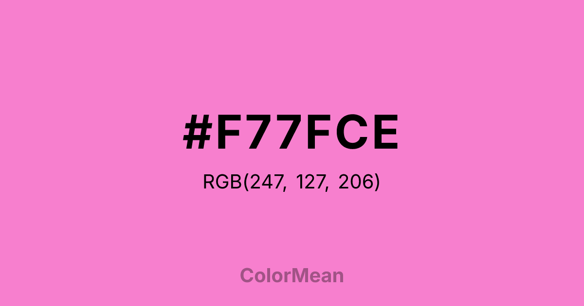 #F77FCE RGB value is (247, 127, 206). The hex color red value is 247, green is 127, and blue is 206. Its HSL format shows a hue of 321°, saturation of 88 percent, and lightness of 73 percent. The CMYK process values are 0 percent, 49 percent, 17 percent, 3 percent.